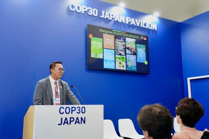Memenuhi undangan JICA untuk mengisi sesi di Paviliun Jepang, pada 13 November 2025, Ristianto Pribadi, Direktur Rehabilitasi Mangrove, mempresentasikan pengalaman Indonesia. Sebagai negara yang memiliki 3,44 juta hektar hutan mangrove—merepresentasikan 23 persen dari total mangrove global—Indonesia memiliki tanggung jawab ekologis sekaligus potensi besar untuk menjadikan restorasi ekosistem sebagai garda terdepan mitigasi dan adaptasi perubahan iklim.